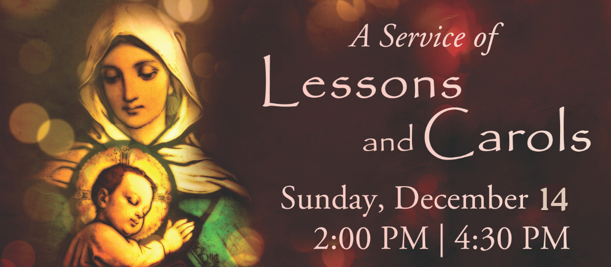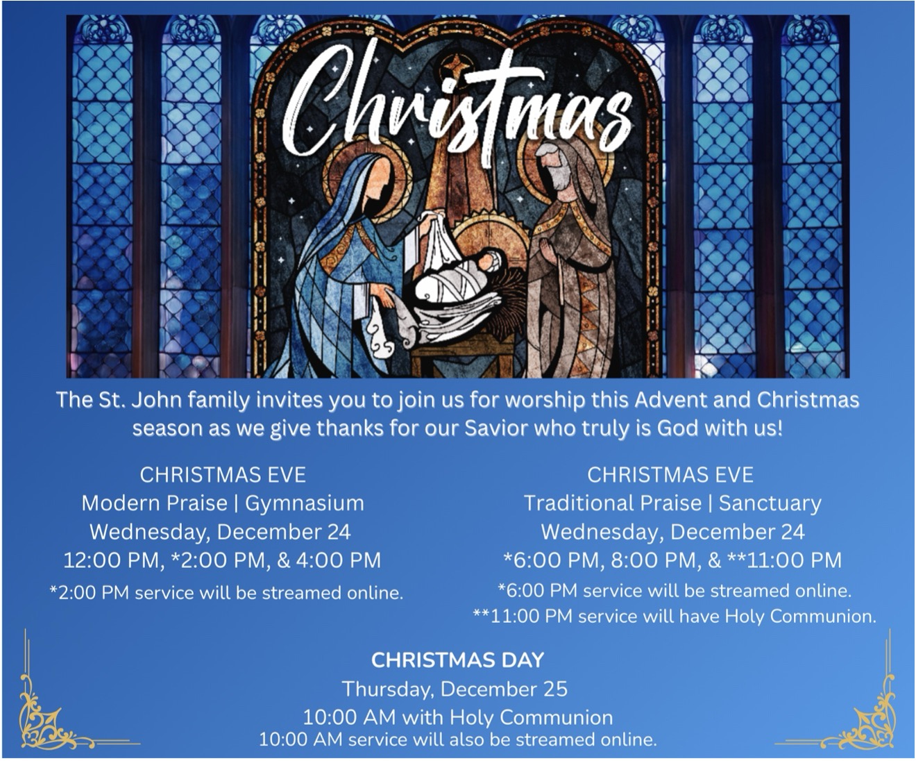 Please join us on Sunday, December 14 at 2:00 PM or 4:30 PM in the church sanctuary for our annual St. John Christmas Concert, featuring many of our St. John music ensembles and instrumentalists. This year’s concert will once again follow the format of the traditional English Lessons and Carols service. Festive instrumental music will begin 10 minutes prior to each service. “O come let us adore Him, Christ the Lord!”